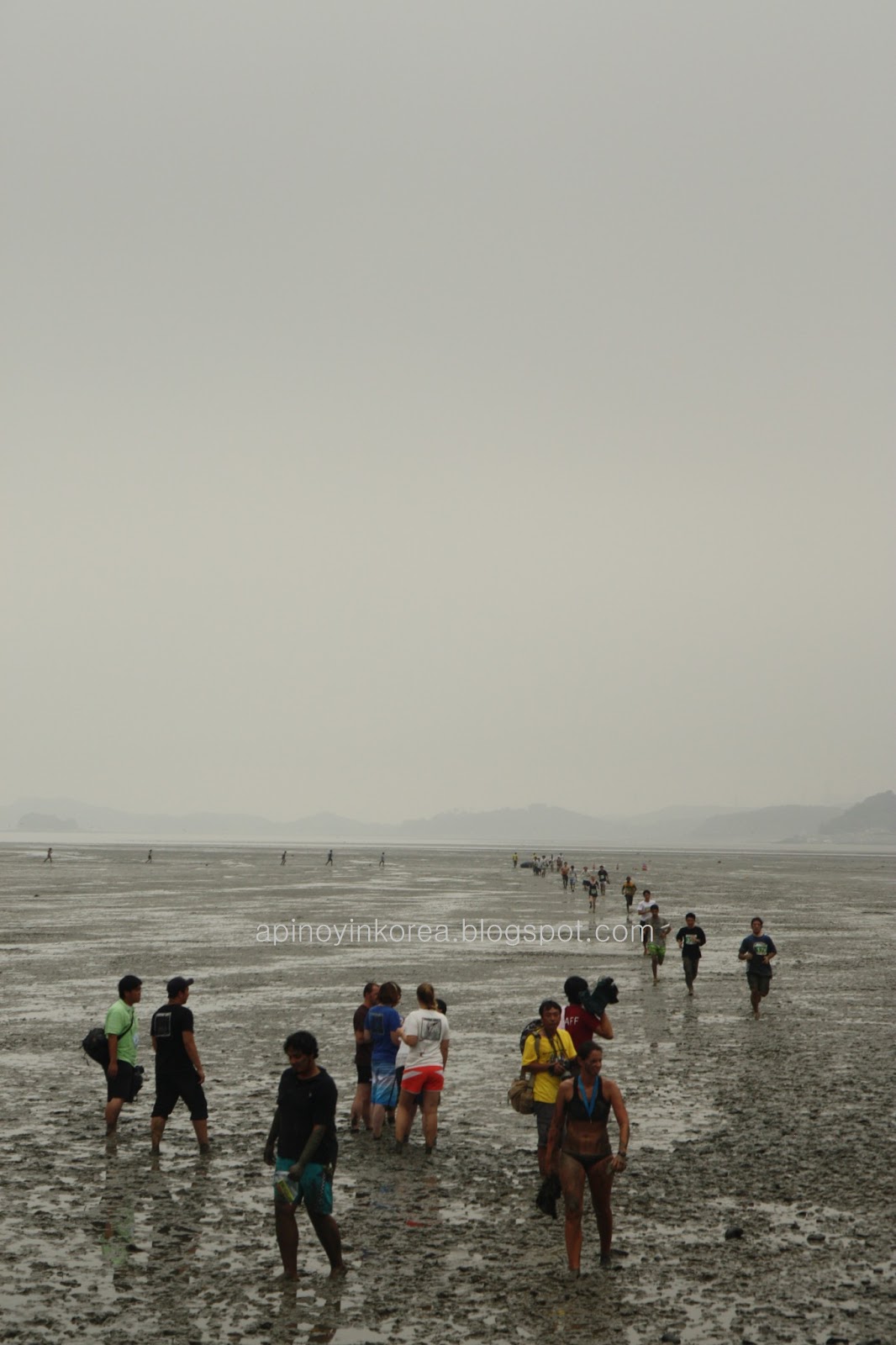 At the starting line, a hundred runners await the sound of the starting gun. The runners were actually advised to wear socks if they want to run without any footwear. Why? The run was on the mud beach on the other side of Boryeong town, where sea shells could slice one's foot if you step on them. But seeing these runners, who not only want to have fun, they also want to win it! This was a serious mad run on the mud! Or a run on mud that's madly serious!